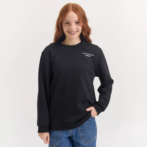 Buzo de frisa liso. Cuello redondo. Tiene estampa en delantero y espalda