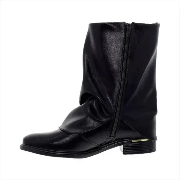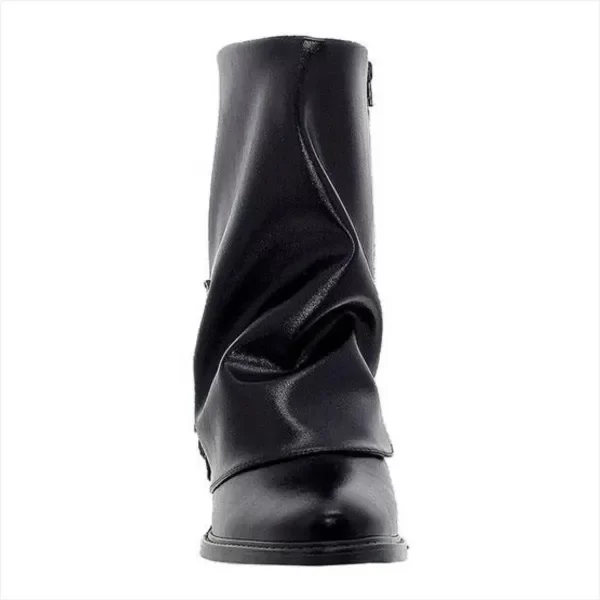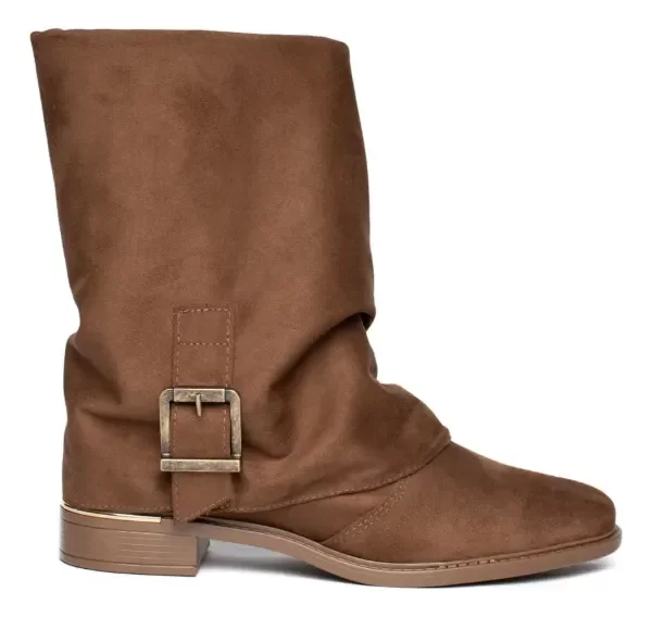 El destaque se encuentra en la caña media con cubierta superpuesta y hebilla metálica, un detalle que añade personalidad y encanto al aspecto. El acabado en material sintético tipo gamuza refuerza la propuesta elegante del modelo, mientras que la puntera redonda y el tacón grueso bajo de 2,5 cm garantizan más comodidad y estabilidad al caminar.
