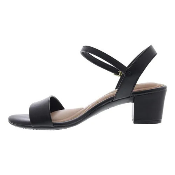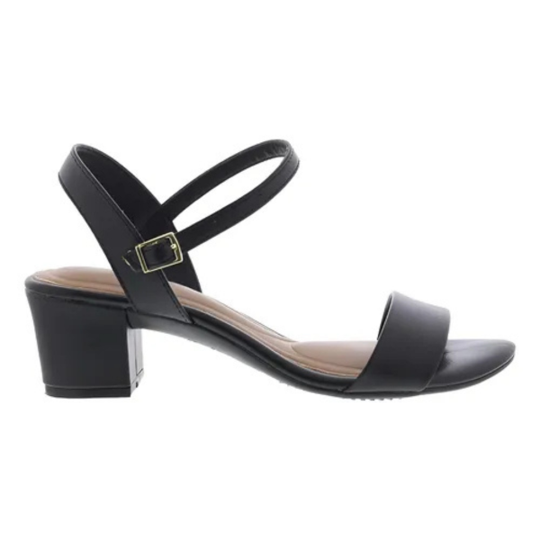 Confeccionada en material sintético, tacón bajo grueso y cierre con hebilla.