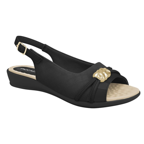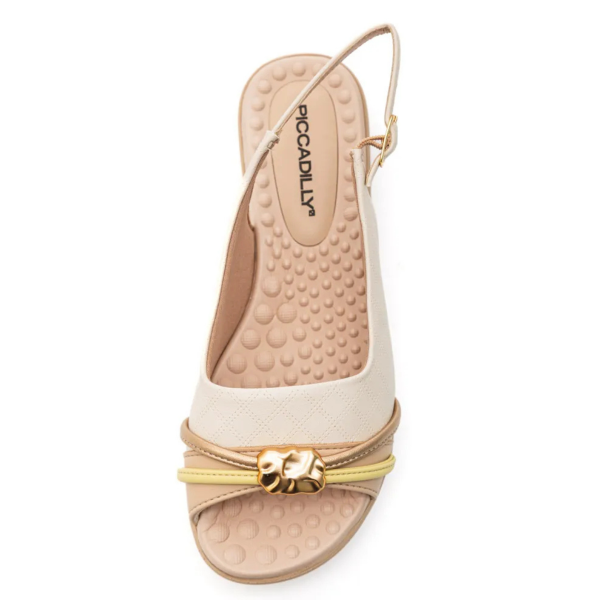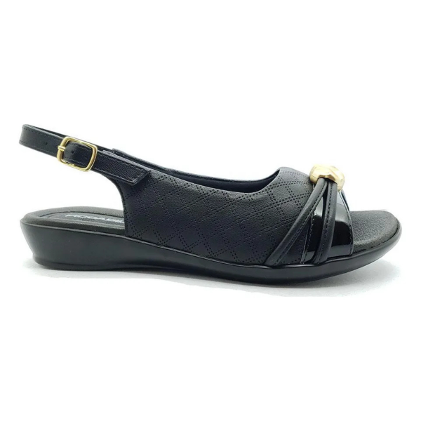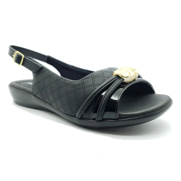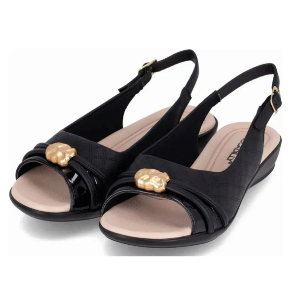 Su destaque se encuentra en el modelo slingback, ofreciendo libertad al calce, empeine con costuras decorativas, banda con charol y aplicación de pedrería sobre los pies.
