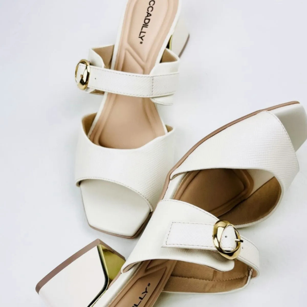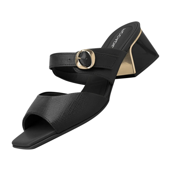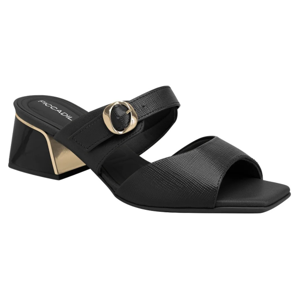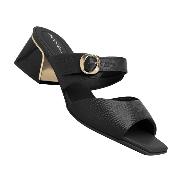 El taco medio tipo bloque, con detalles dorados, proporciona estabilidad y un toque de lujo al look.